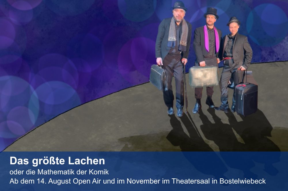 Drei sehr komische Gestalten kommen diesen Sommer nach Bostelwiebeck. Sind es drei durchgeknallte Wissenschaftler, drei Hochstapler, drei Clowns? Auf jeden Fall behaupten sie das älteste Rätsel der Menschheit gelöst zu haben: Sie haben die mystische Formel von Oldupai entschlüsselt und damit die Frage aller Fragen gelöst: Was macht den Menschen zum Menschen? Und die Antwort gibt uns allen großen Anlass zur Hoffnung und macht auf jeden Fall Lust auf einen äußerst vergnüglichen Theaterabend: Der Mensch wird zum Menschen durch seine Fähigkeit zu lachen. Gemeinsam zu lachen! Und die drei werden es den Theaterbesuchern beweisen, denn die urzeitliche Formel ist nichts anderes als das ultimative Regelwerk für das GRÖSSTE LACHEN, die Mathematik der Komik.